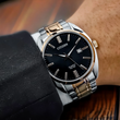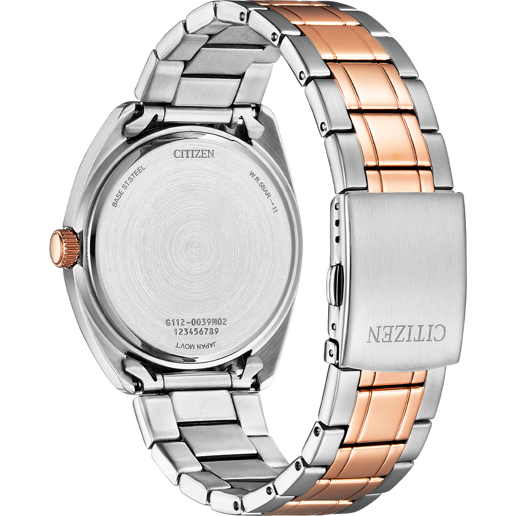 Sleek, modern, and versatile—the Citizen BI5104-57E is a men’s quartz watch that combines contemporary design with reliable performance. Featuring a bold black round dial with a date display, a sturdy silver stainless steel case, and a refined two-tone silver & rose gold bracelet, this watch is perfect for both formal and casual wear.