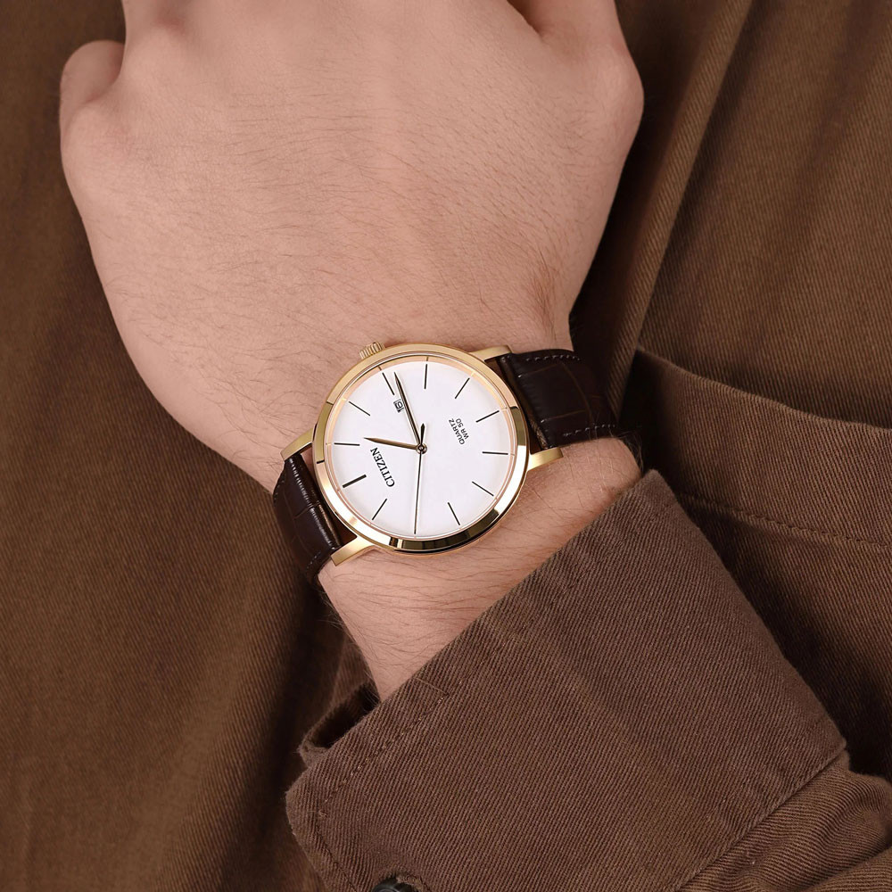 Refined and versatile, the Citizen Quartz BI5072-01A is a classic men’s dress watch that blends timeless design with modern reliability. Featuring a gold-plated stainless steel case, clean silver dial with date display, and a premium brown calf leather strap, this timepiece is the perfect everyday accessory for the modern gentleman.