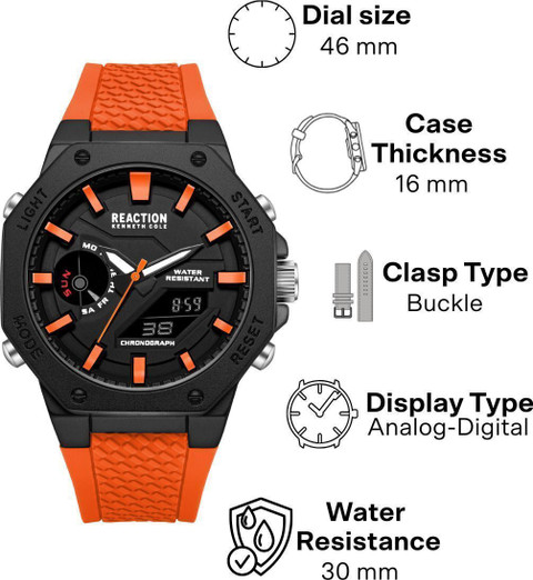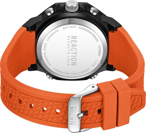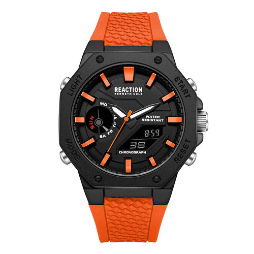 Stand apart with the Kenneth Cole Reaction Men’s Analog-Digital Watch – KRWGP0069102. Designed with a striking octagonal case, sleek black dial, and eye-catching orange strap, this timepiece delivers fearless design with modern functionality.