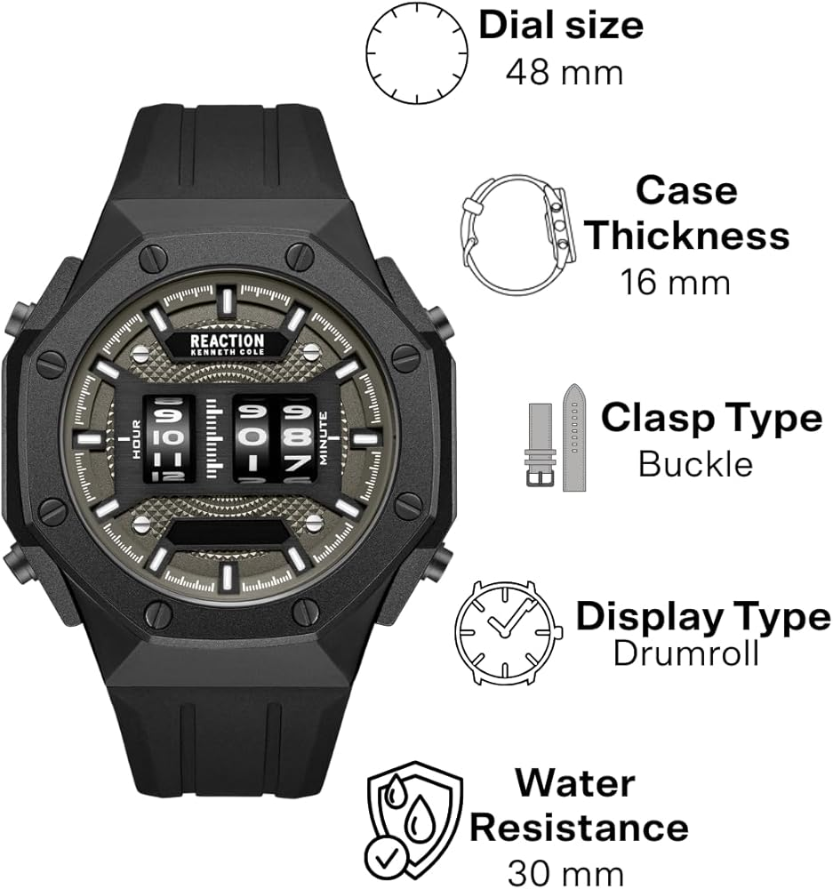 Make a fearless style statement with the Kenneth Cole Reaction Men’s Analog Watch – KRWGQ0069601. Featuring a massive 48mm octagonal case, refined grey dial, and a solid black alloy steel strap, this watch is built for men who prefer bold, industrial-inspired fashion with modern precision.