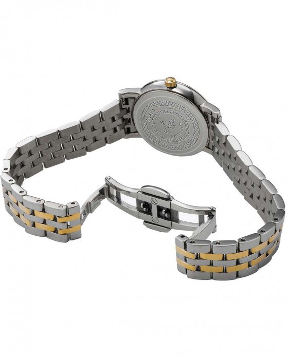 The bicolor stainless steel link bracelet complements the case perfectly and secures comfortably with a butterfly clasp with push buttons. Designed to fit wrist sizes from 150 mm to 190 mm, it delivers both comfort and style throughout the day.