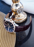 The 44 mm stainless steel case provides a strong wrist presence without sacrificing comfort. A scratch-resistant sapphire crystal protects the dial, while the brown leather strap adds warmth and classic appeal. The butterfly clasp ensures a secure and elegant closure.