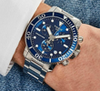 Featuring a striking blue analog dial protected by scratch-resistant sapphire crystal, this watch delivers long-lasting clarity and durability. The 45mm stainless steel case and matching silver bracelet offer a strong, masculine presence, while the Swiss quartz movement ensures reliable, accurate timekeeping.